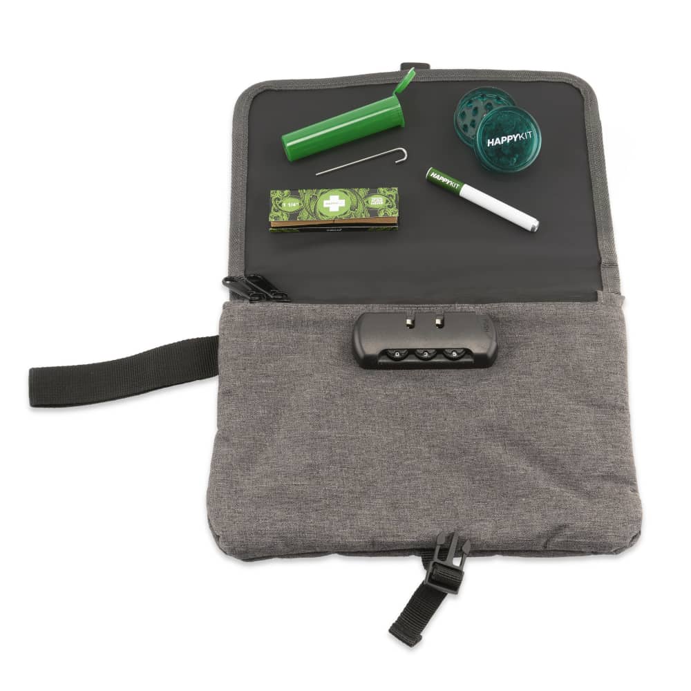 The Happy pouch has a full carbon lining, the front flap doubles as a rolling tray, and everything is secured with a 3-digit combination lock.